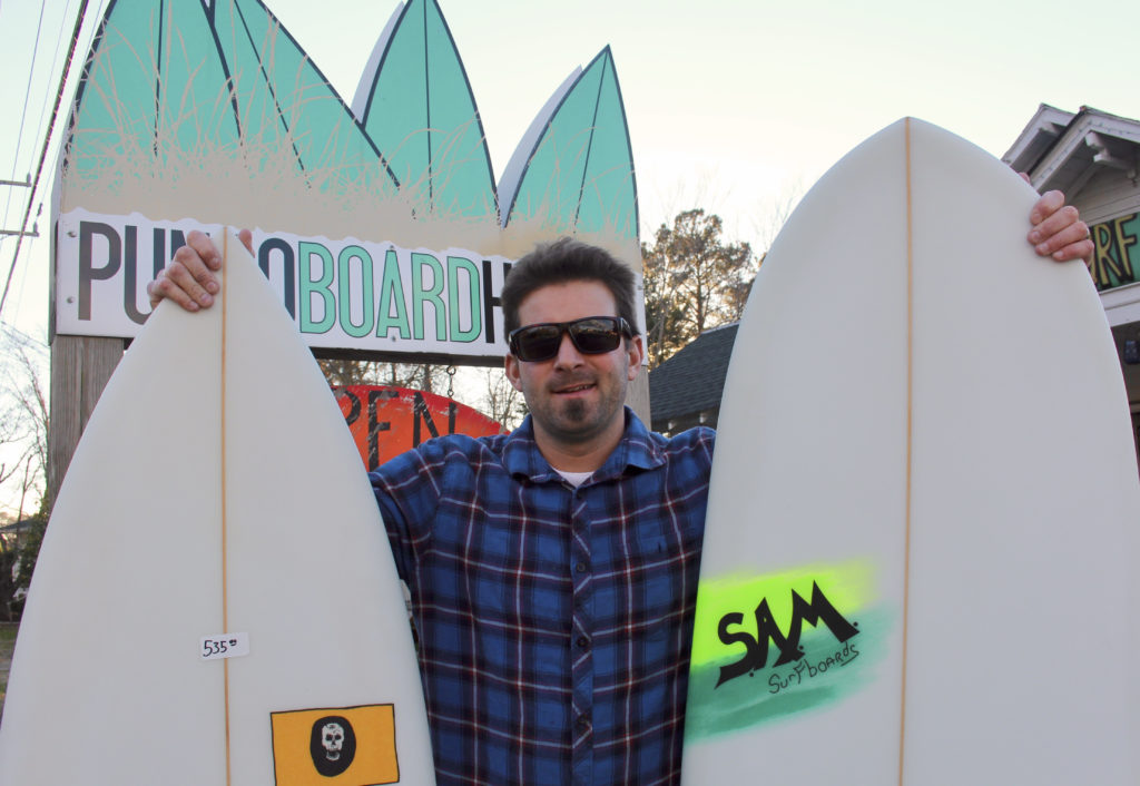 Dylan Rogers, owner of Pungo Board House, holds two of the stock surfboards made by Steve A. Morris that are sold at the shop in Pungo. The board on the left has a Pungo Board House brand and the board on the right shows an S.A.M. Surfboards brand, which is Morris’. Morris also makes custom shortboards and longboards of all kinds. [John-Henry Doucette/The Princess Anne Independent News]