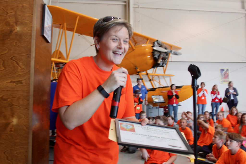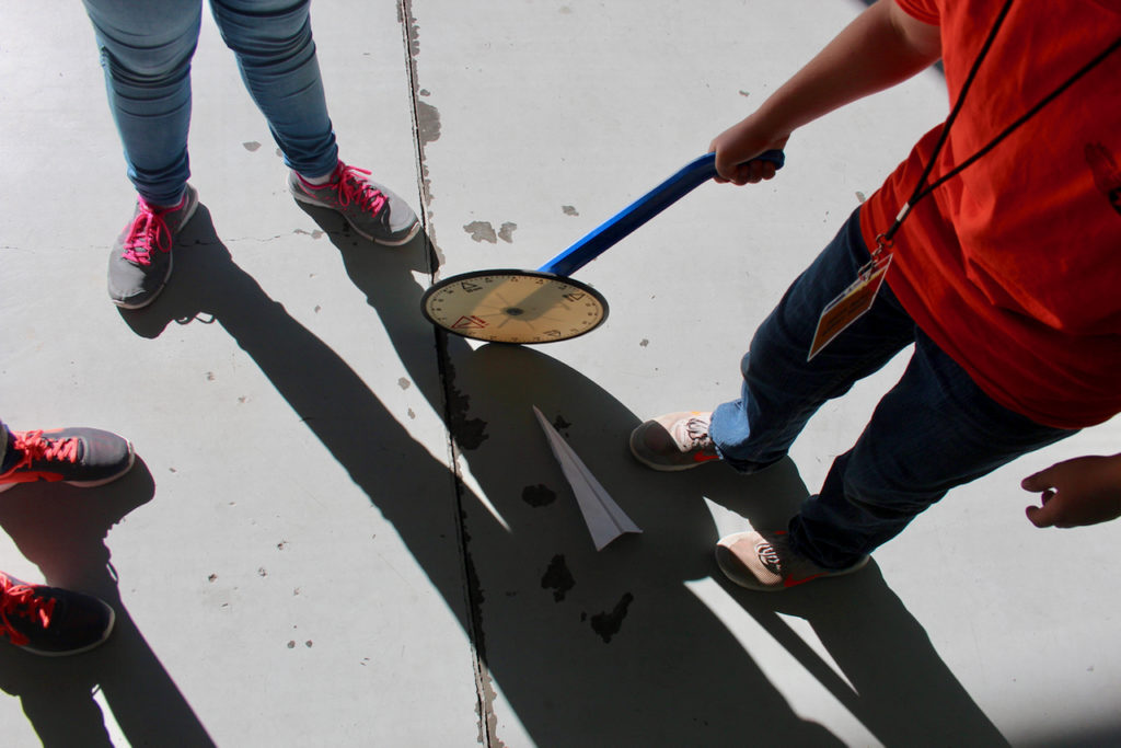 Students from Creeds Elementary School had roles to play in executing the event, from tracking the progress of the competing teams to measuring distance of the paper airplanes to holding signs that asked for quiet in the thick of the contest.