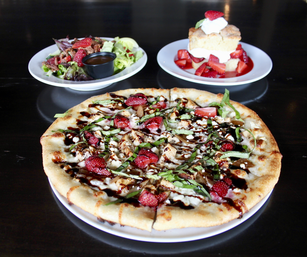It combines strawberries, goat cheese, caramelized onions and grilled chicken on New York pizza dough. The concoction is cooked until the strawberries become almost jelled, and the combination of berries and onions lends a sweet taste to the cheese and chicken.