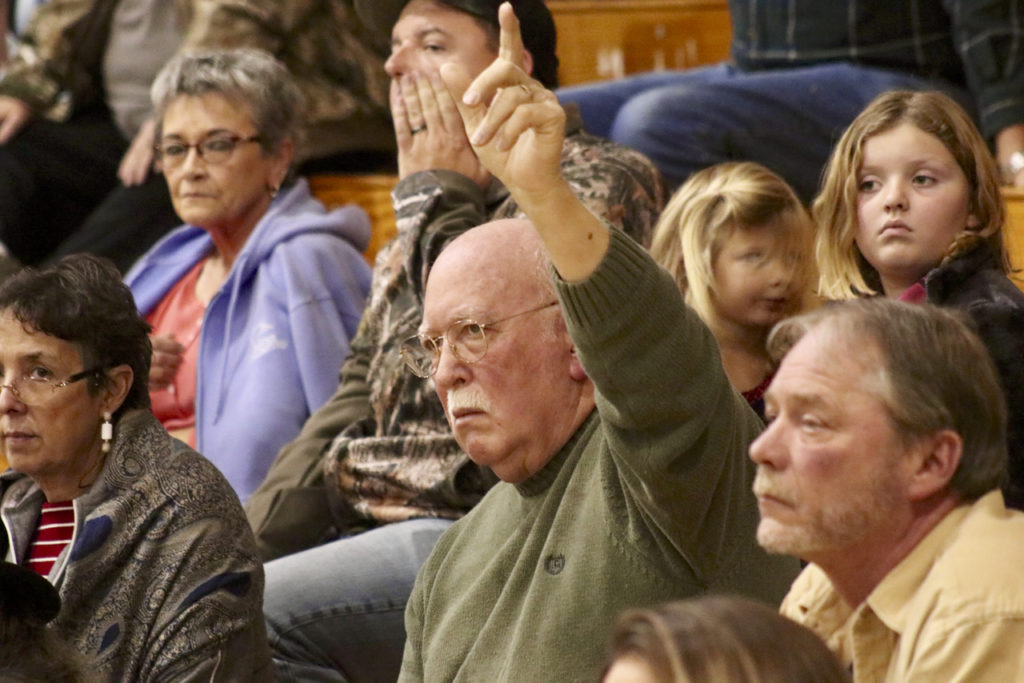 Terry King of Knotts Island raises his hand to speak during a meeting Tuesday, Dec. 12, about fire service in the isolated community. [John-Henry Doucette/The Princess Anne Independent News]