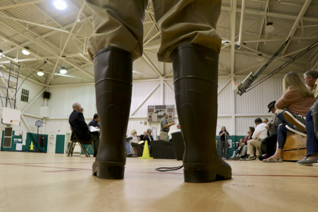 William Grimes, whose boots are shown, waits to speak during the community meeting about fire service on Tuesday, Dec. 12, at Knotts Island Elementary School. [John-Henry Doucette/The Princess Anne Independent News]