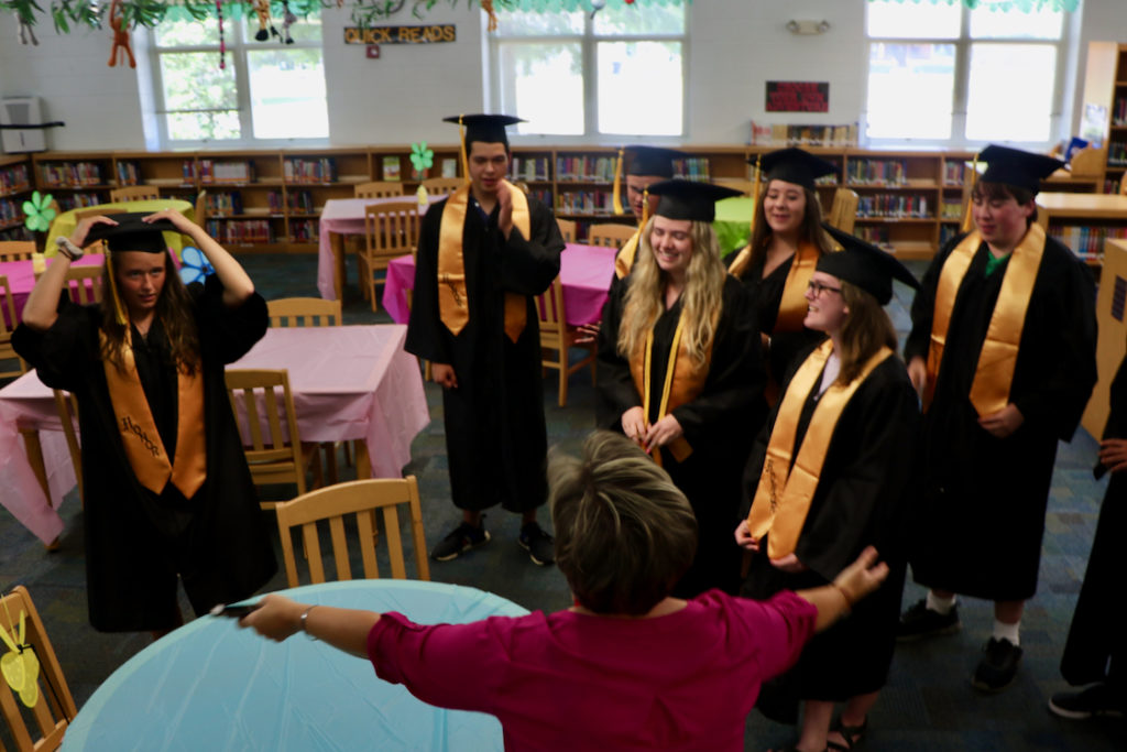 The procession started from the library and headed through the school toward the gymnasium. The high school students, in their caps and gowns, waved amid the applause. There were high fives. There were hugs.