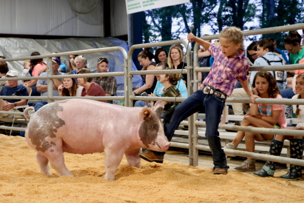 Leah Gentry, 8, of Back Bay nudges a hog back on course. [John-Henry Doucette/The Princess Anne Independent News]