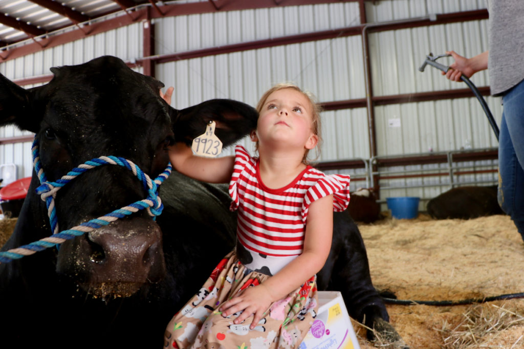 Riley Wallace, 4, sits with Winston, a steer raised by her cousin, 13-year-old Emily Kovacs. Riley’s mom, Lindsay Wallace, is spraying Winston to help the steer keep cool. [John-Henry Doucette/The Princess Anne Independent News]