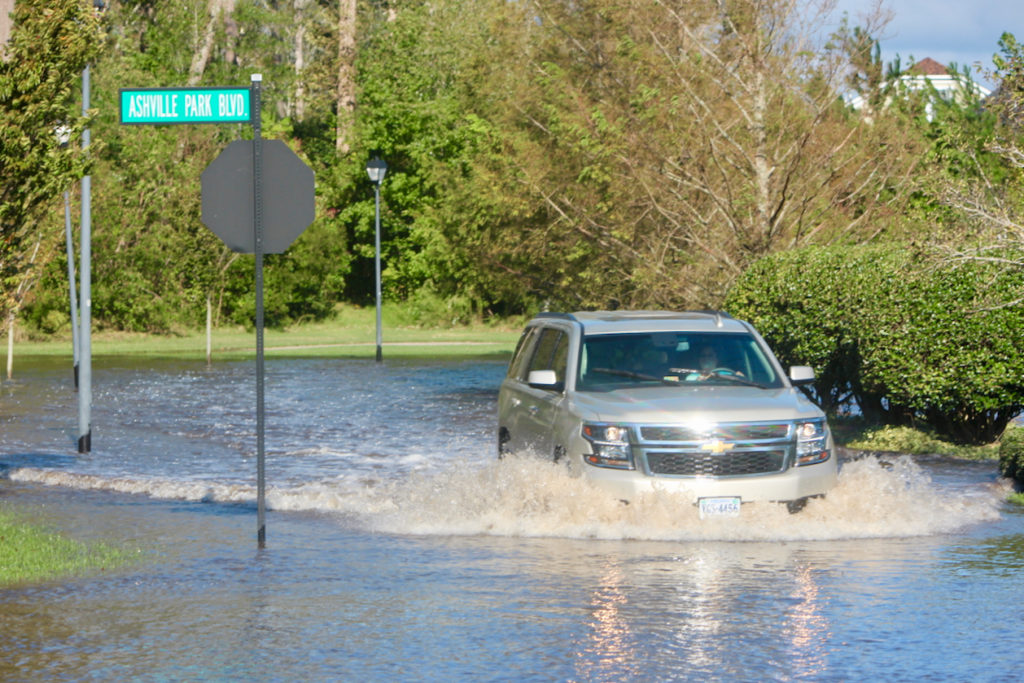 A driver braves a flooded street in Ashville Park after Hurrican Matthew in 2016. [John-Henry Doucette/The Princess Anne Independent News]