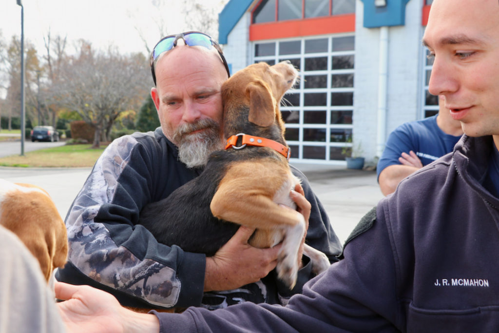 After deliveries to Blackwater and Creeds were done, Grimstead let a few hunting dogs out of the back of his truck to mingle with fire fighters and take pictures.