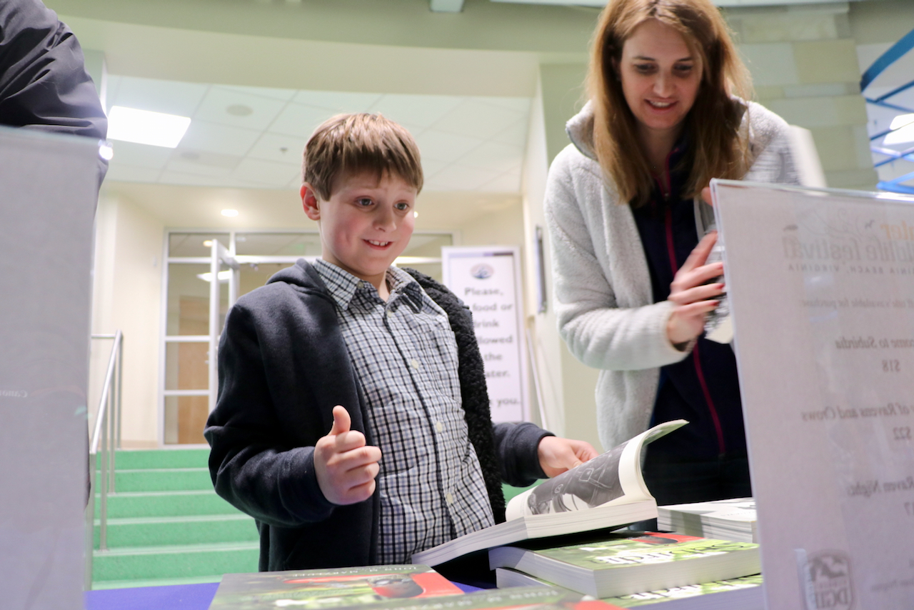 After the talk, Caleb Jake Van Grack, 9, was among the people who picked up one of Marzluff’s books. Van Grack and his mom, Kate Bollie, came all the way to Virginia beach from Germantown, Md. Bollie said they came to the festival last year, too, and this was a good time of year to enjoy deals on hotels here.