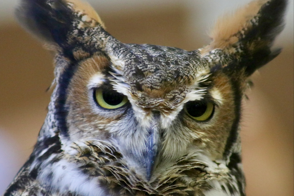 Sister, a rescued great horned owl, was among the stars of the Winter Wildlife Festival exhibit hall at Princess Anne Recreation Center. [John-Henry Doucette/The Princess Anne Independent News]