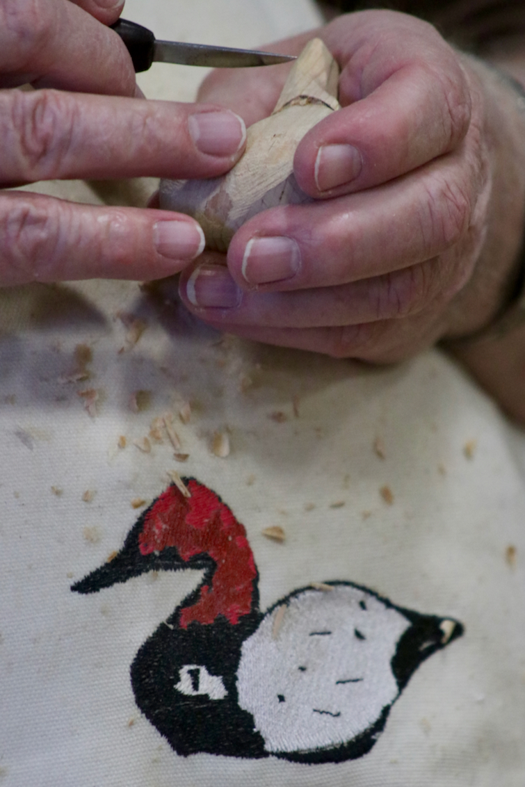 Jamie Champe of Lago Mar carves a miniature canvasback decoy on Saturday in the exhibition hall. Carving, a beloved tradition in southern Virginia Beach, is a star attraction at the Atlantic Wildfowl Heritage Museum at the Oceanfront. [John-Henry Doucette/The Princess Anne Independent News]