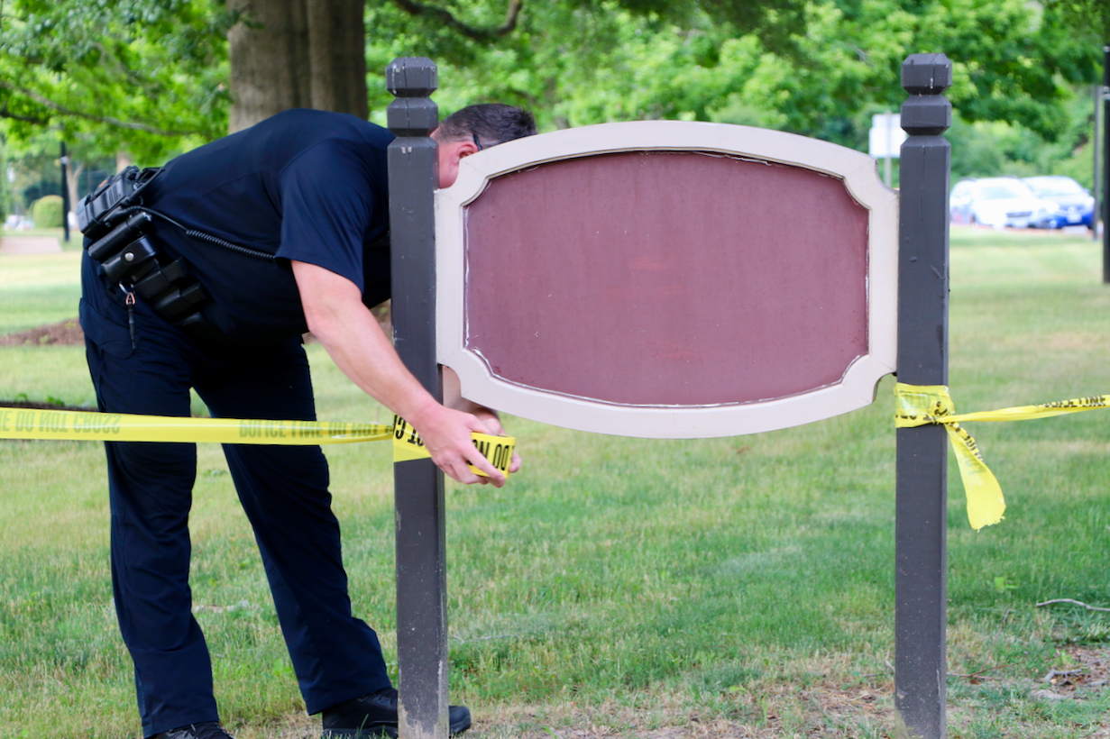 A police officer places crime scene tape around a piece of evidence at the Virginia Beach Municipal Center following the mass shooting on Friday, May 31. [John-Henry Doucette/The Princess Anne Independent News]