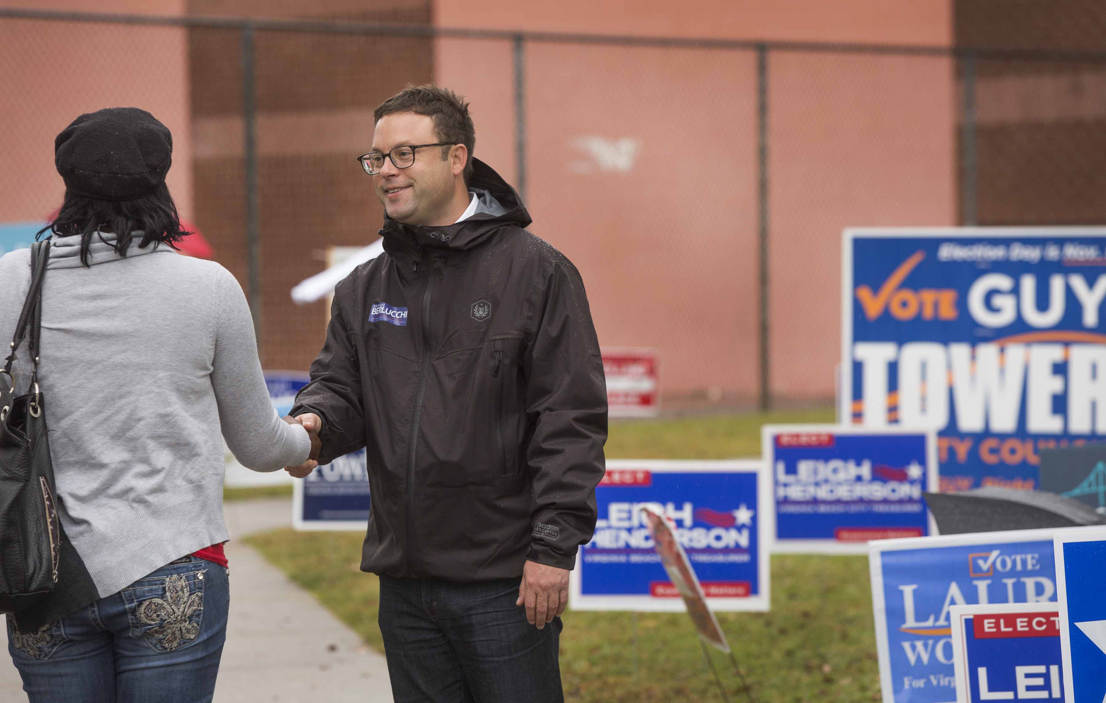Virginia Beach City Councilmember Michael Berlucchi, who won a special election to keep the Rose Hall District seat to which he was appointed this spring, greets voters outside Rosemont Forest Elementary School early on Election Day. [Bill Tiernan/For The Independent News]