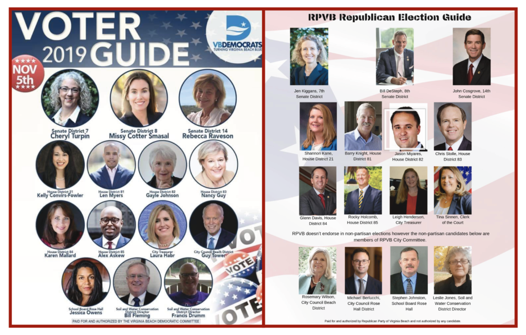 Last year, candidates for nonpartisan offices – including Virginia Beach seats on the soil and water conservation board – appeared on a voter guide produced by Virginia Beach Democrats. The Republican Party of Virginia Beach also produced a voter guide, but its guide clearly specified the party does not endorse in nonpartisan races. It showed some candidates for nonpartisan offices, noting only that they are members of the city committee.