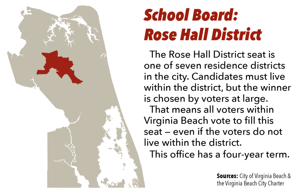 Ed. — The following are responses to questions posed by The Independent News to candidates for the Rose Hall District seat on the Virginia Beach School Board on the Tuesday, Nov. 3, ballot. Answers to our questions in this series generally are not edited, aside from obvious punctuation issues, spacing and formatting, or for clarity. The print edition containing our full voter guide is now on stands. Please reach the editor with any questions or concerns via email.