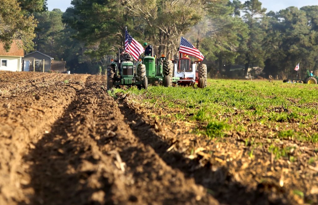 The participants, some of whom were waving American flags from their tractors, plowed about 50 acres, and the loamy soil was lightly colored and relatively dry despite drenching rains earlier in the week.