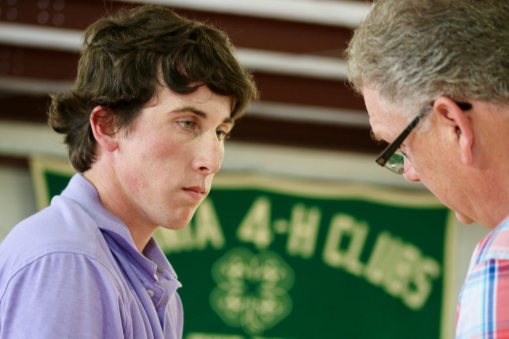 Wyatt Schratwieser, 17, of Gibbs Woods, N.C., listens to Dr. Scott Greiner of Virginia Tech, who judged the livestock show portion of the 2021 Virginia Beach 4-H Livestock Club Show and Sale. [John-Henry Doucette/The Princess Anne Independent News]
