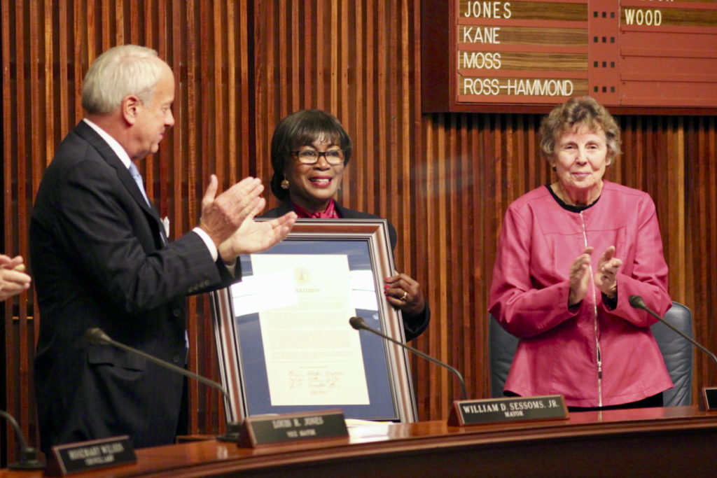Dr. Amelia Ross-Hammond, at center, is recognized during her final meeting as the Kempsville District representative on the Virginia Beach City Council in December 2016 at City Hall. Ross-Hammond is now among the three finalists for appointment to the now-vacant district seat. [File/The Princess Anne Independent News]