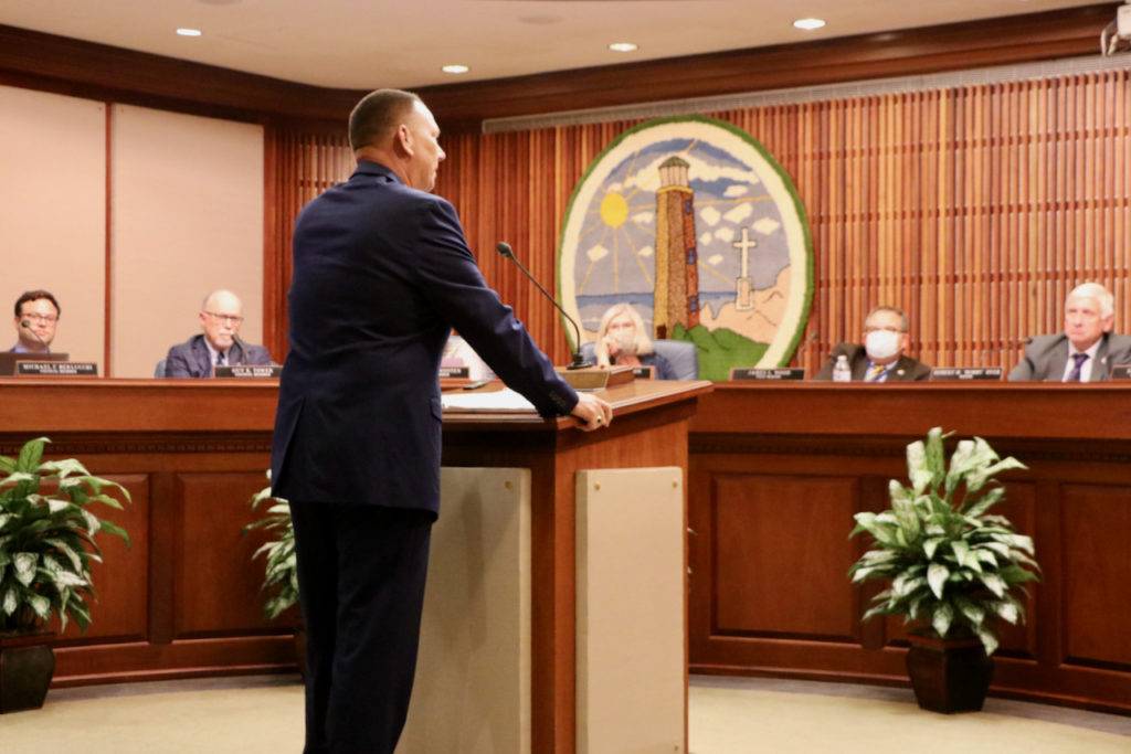 Former state Del. Rocky Holcomb, a finalist for appointment to the vacant Kempsville District seat on the Virginia Beach City Council, addresses council on Tuesday, Aug. 10, during a special meeting at City Hall. [John-Henry Doucette/The Princess Anne Independent News]