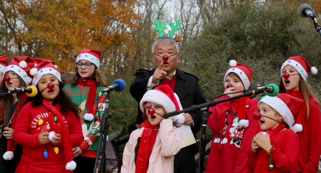 Ryu, the senior pastor at Charity United Methodist Church, asked the crowd how many years they had attended the tree lighting. Some were long-timers, and others were new.