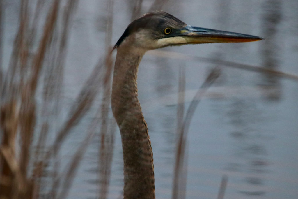 A great blue heron hunts in a canal at Mackay Island National Wildlife Refuge in Knotts Island, N.C., on Sunday, Jan. 9, 2022. The refuge is a sanctuary for a wide range of wildlife, including shore birds and migratory birds. [John-Henry Doucette/The Princess Anne Independent News]