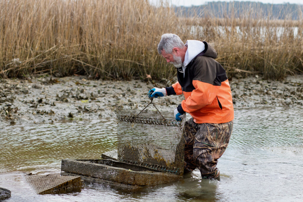 When the oysters grow big enough, he puts as many as fit into the cages. Oysters don’t mind being in cages.