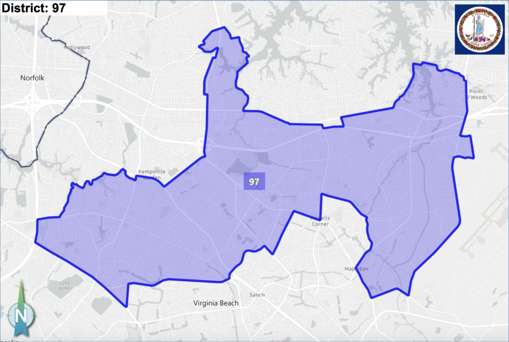 The new Virginia House of Delegates District 97 is contained entirely within the city of Virginia Beach. The district is a competitive one, according to analysis by the Virginia Public Access Project. State Del. Karen Greenhalgh is the incumbent. [Supreme Court of Virginia]