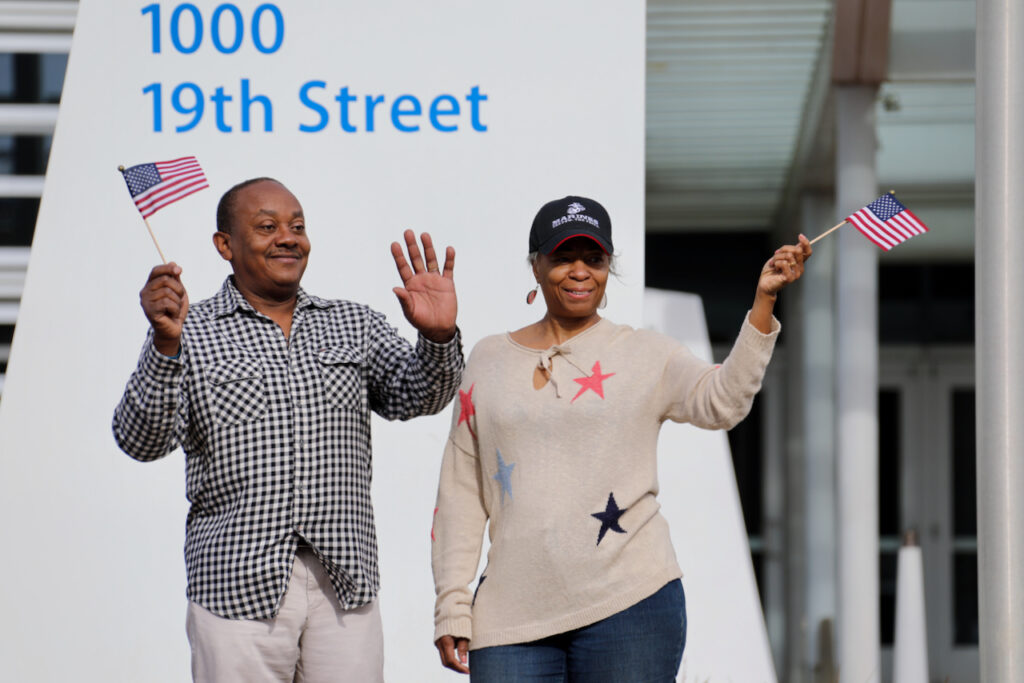 The Rev. Terrance Taylor and Edna Taylor of Norfolk wave flags as the Tidewater Veterans Day Parade passed in front of the Virginia Beach Convention Center on Monday, Nov. 11, 2024, at the Virginia Beach Oceanfront. Terrance Taylor is a veteran, and the Taylors attended the parade for the first time this year — and plan to return in 2025. [John-Henry Doucette/The Princess Anne Independent News]