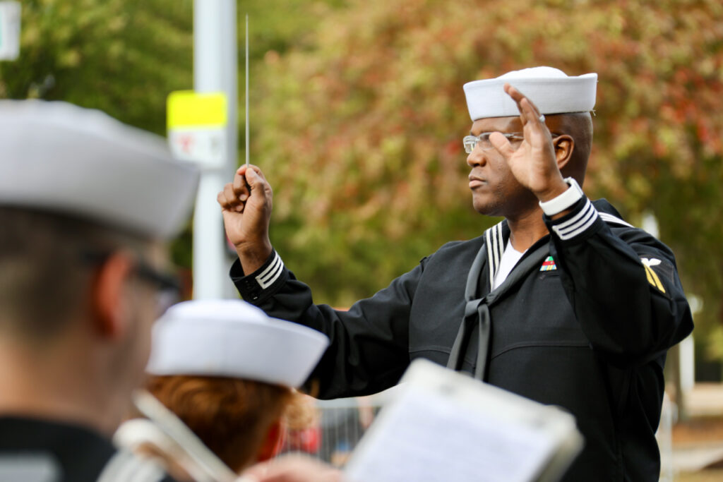 U.S. Navy Petty Officer 1st Class Winnie Dawkins, a Navy musician, serves as the U.S. Fleet Forces Band’s ceremonial conductor at the Tidewater Veterans Memorial following the Tidewater Veterans Day Parade on Monday, Nov. 11, 2024, at the Virginia Beach Oceanfront. [John-Henry Doucette/The Princess Anne Independent News]