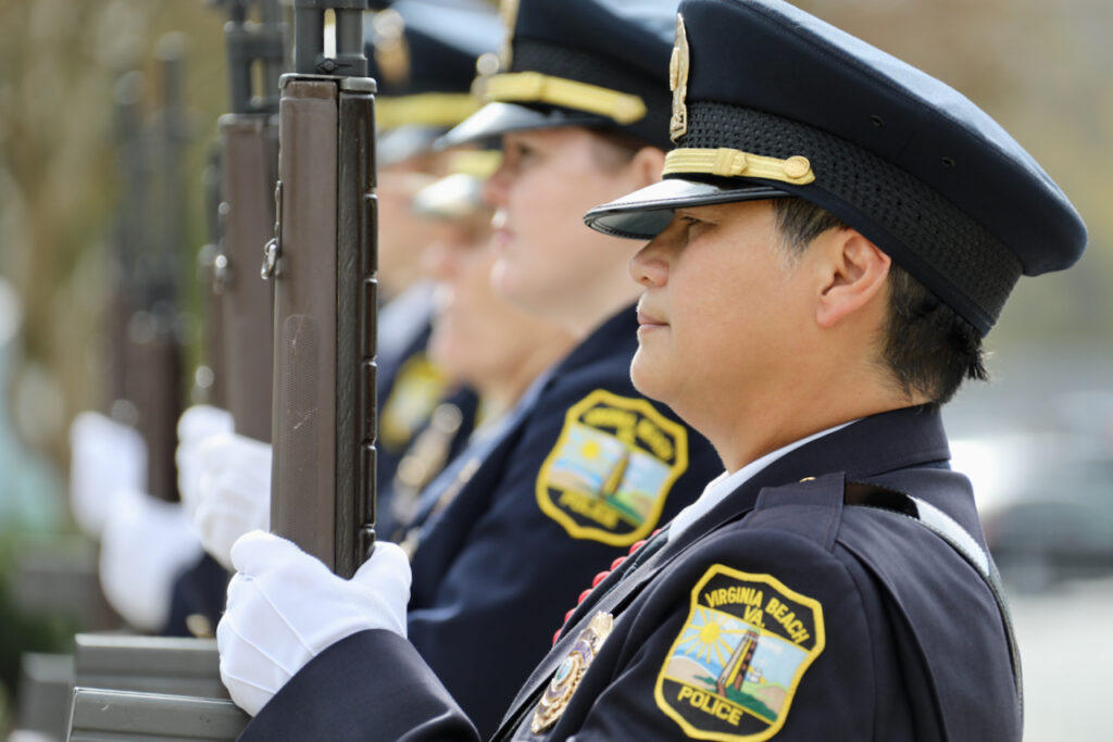 Virginia Beach Master Police Officer D. Paniza of the police department’s honor guard stands at present arms during the playing of The National Anthem at the Tidewater Veterans Memorial at the Virginia Beach Oceanfront on Monday, Nov. 11, 2024. The honor guard’s firing party rendered a rifle salute during the ceremony that followed this year’s Tidewater Veterans Day Parade. [John-Henry Doucette/The Princess Anne Independent News]