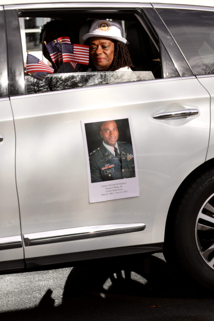Barbara Newton rides during the 2024 Tidewater Veterans Day Parade on Monday, Nov. 11, 2024, at the Virginia Beach Oceanfront in honor of her son, U.S. Army Capt. Michael W. Newton, who is shown in the photograph on the side of the car. Michael Newton, a Newport News native and graduate of the Virginia Military Institute, died in 2011 while serving in Afghanistan. He was 30. Barbara Newton rode during the parade with other members of the Hampton Roads Chapter of American Gold Star Mothers. “I’m honoring my son and all the other sons here,” Barbara Newton said after participating in the parade. “This is Veterans Day.” [John-Henry Doucette/The Princess Anne Independent News]